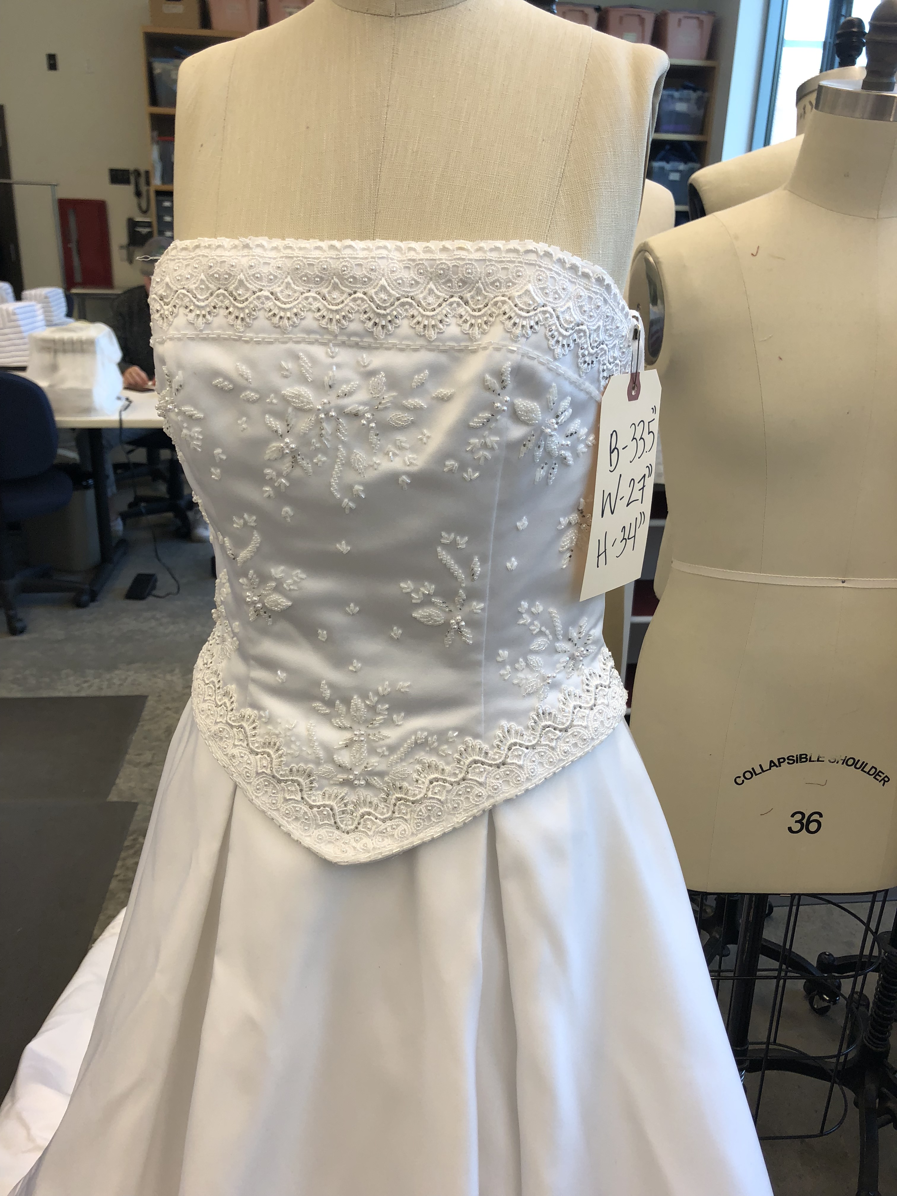 Six total? From the end of the Spring 2018 semester until today, six dresses donated by a very kind and enthusiastic donor. We find ourself going through both new and old stock of wedding dresses, measuring gems here and there, and finding: