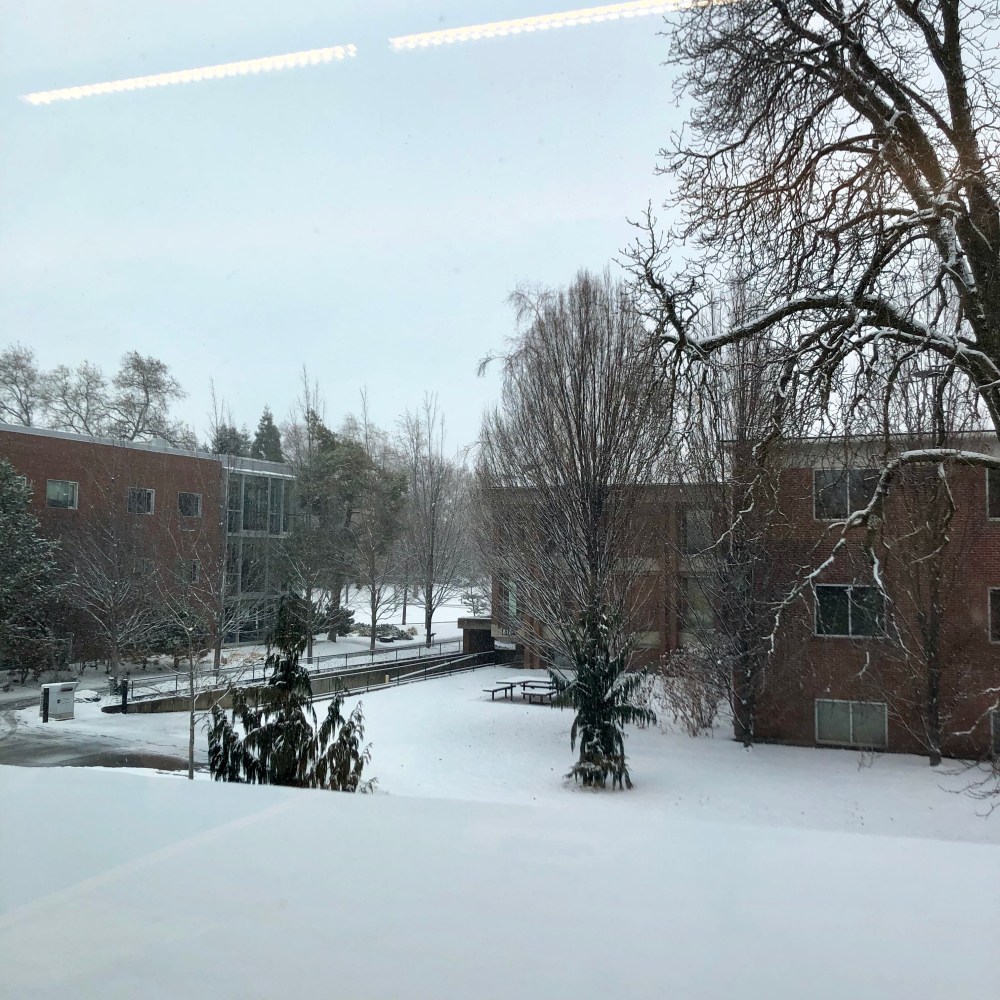 It has been a strange one. Everyone I encountered remarked that the day wasn’t the best or upon its strangeness. From snowfall during a lecture, distracting all, to a broken tooth (thank you-not thank you Bon Appetite), I was hunkering down for the long haul. I do have to admit, however, that the afternoon had a beautiful view….