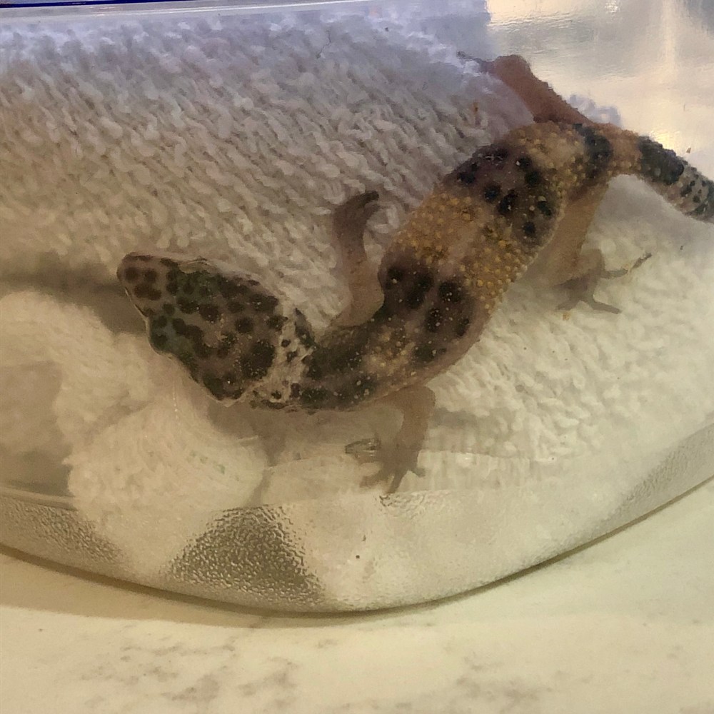 This gecko survived, by whatever means he could, until his hero found him in men’s hats after restocking a clown wig.