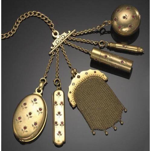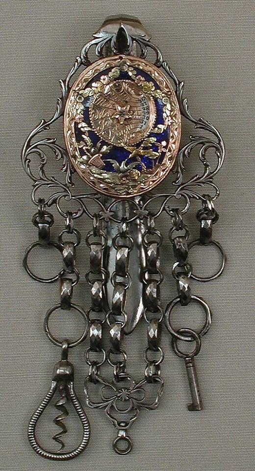 The concept of waist-hung items is almost universal across all cultures. Japanese netsuke… Chinese embroidered pouches… Chaucer’s Pardoner… but the chatelaine was a more useful addition to an outfit, facilitating the demand of plurality placed upon women.