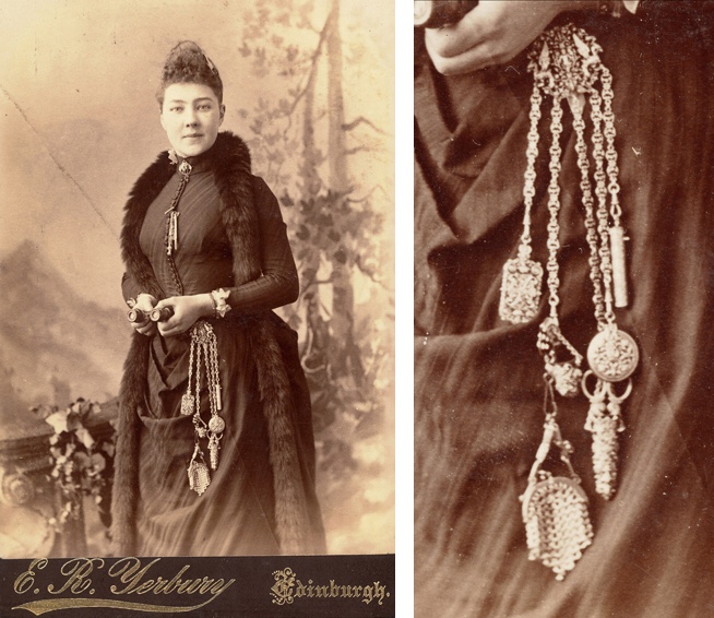 Above is a daguerreotype of a woman being photographed with her chatelaine, and a close up.