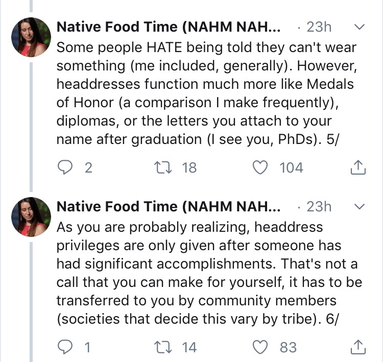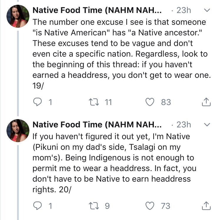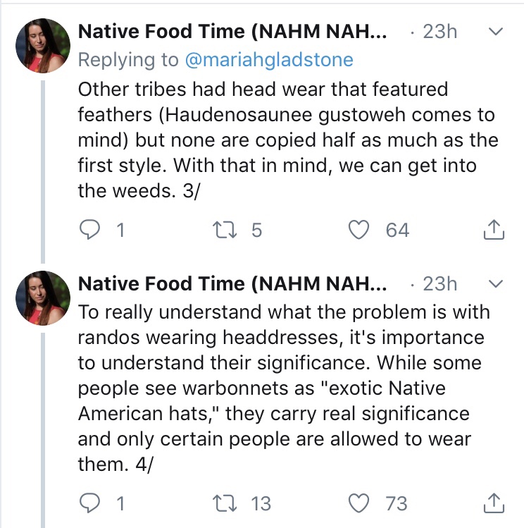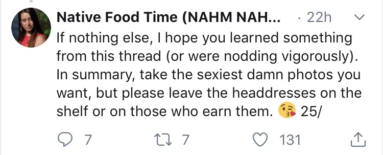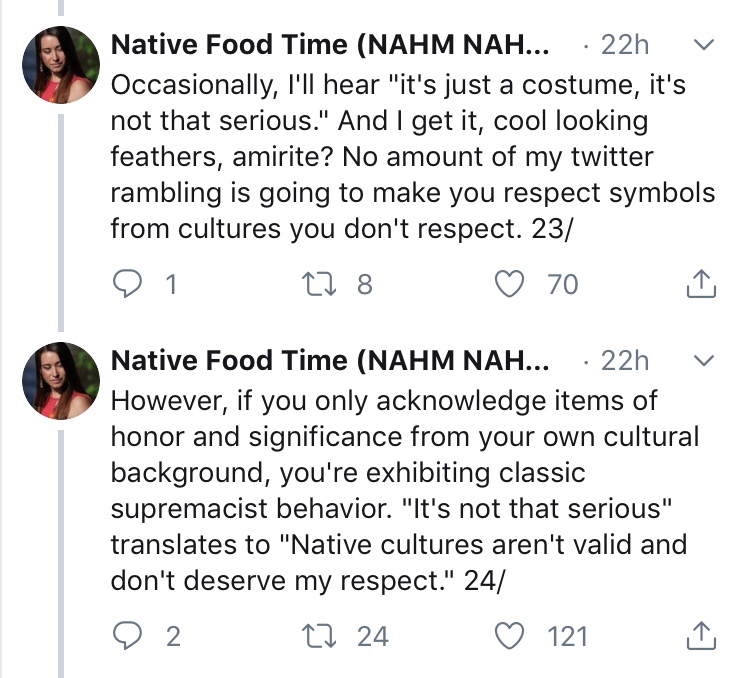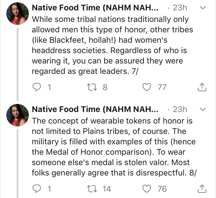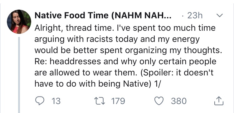 In an excellent thread, Mariah Gladstone gives us the all the reasons why non-Native people shouldn’t wear regalia. Take the time to educate yourself.